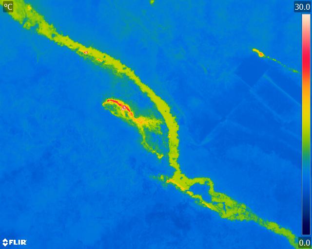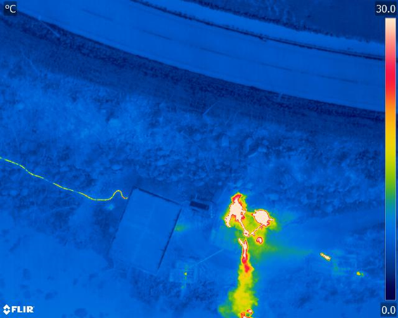 空中赤外測定の例です。 とある地方の町営の露天風呂を上空150mから撮影した画像です。 露天風呂の湯気の他に、温泉配管が明瞭に温度異常として捉えられています。