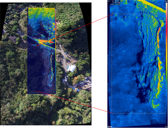 地熱地帯の変質帯の例です。 赤外画像から温度異常エリアの面積と周辺との温度差を求め、関岡・湯原の式を使って放熱量を求めました。 広域を飛行して撮影すれば、地熱資源探査の概査の役割を果たすことができます。