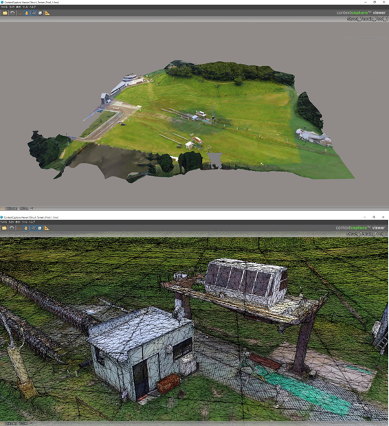 Context Captureによる3次元モデル再構成 可視カメラで撮影した写真から再構成したスキー場の例です。 写真のように見えるかもしれませんが3次元モデルになっています。 ズームすると3次元モデルになっていることを確認できます。